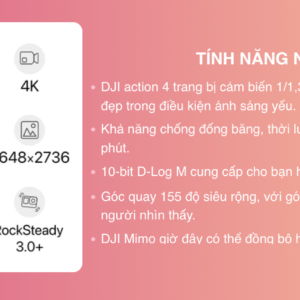 DJI Action 4 Combo được trang bị nhiều thông số kỹ thuật đáng chú ý, hỗ trợ tốt cho quay phim, ghi hình của người dùng được ổn định, mượt mà hơn. Các tính năng này giúp cải thiện đáng kể chất lượng hình ảnh và âm thanh, đồng thời tăng cường tính linh hoạt cho người dùng trong nhiều tình huống quay khác nhau.