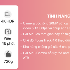 DJI Air 3 fly more combo là sự kết hợp hoàn hảo giữa công nghệ tiên tiến và tính năng đa dạng, mang đến cho người dùng trải nghiệm bay từ trên cao không thể bỏ qua. Dưới đây là một số tính năng gây ấn tượng mạnh của DJI Air 3 combo: