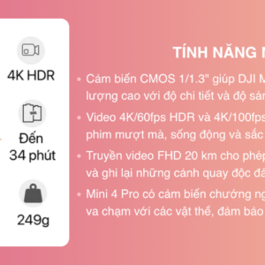– Quay video 4K/60fps HDR và 4K/100fps Slo-Mo: Mini 4 pro Cho phép bạn ghi lại các cảnh quay chất lượng cao và hiệu ứng Slow-Motion đẹp mắt.